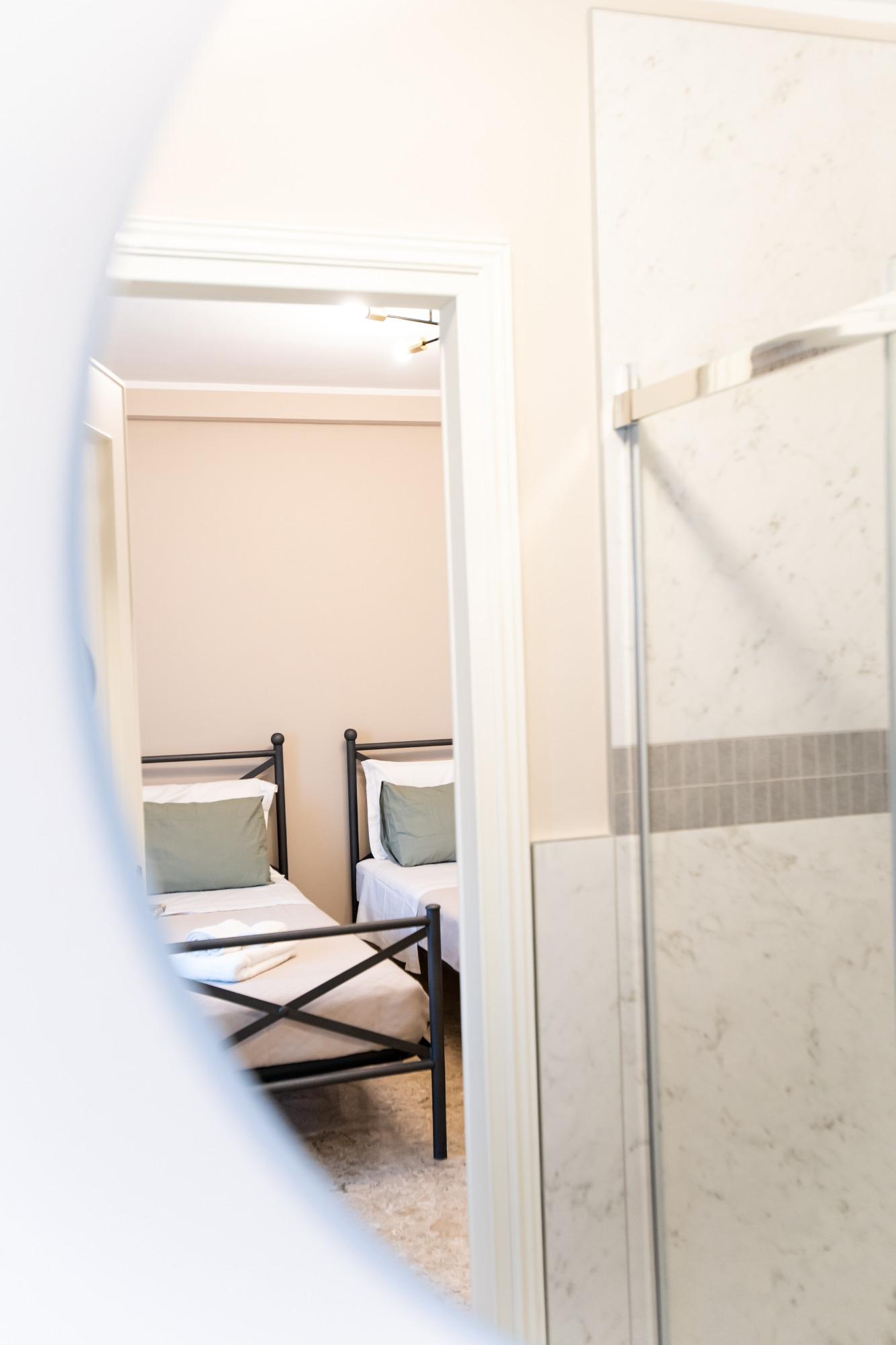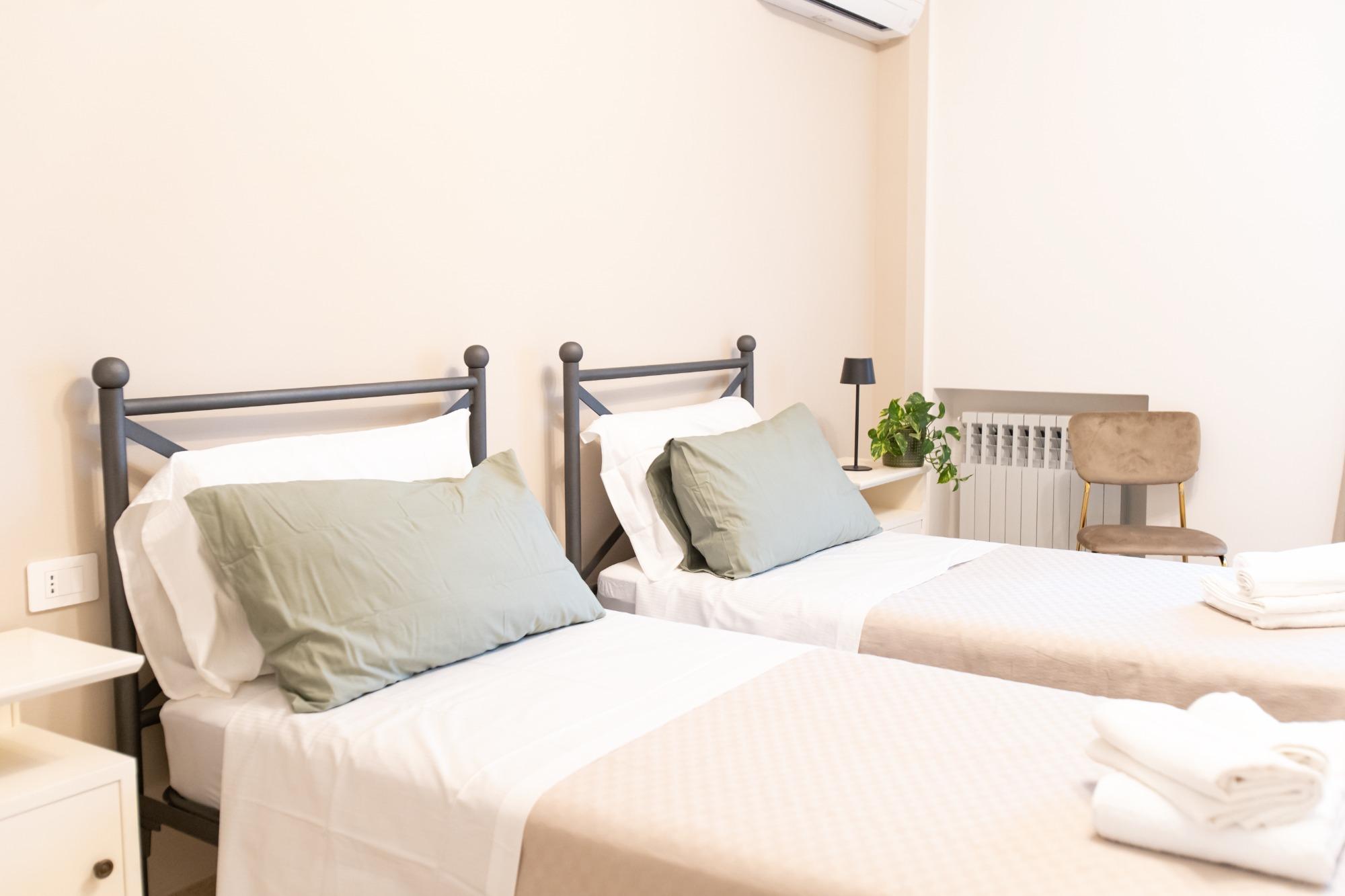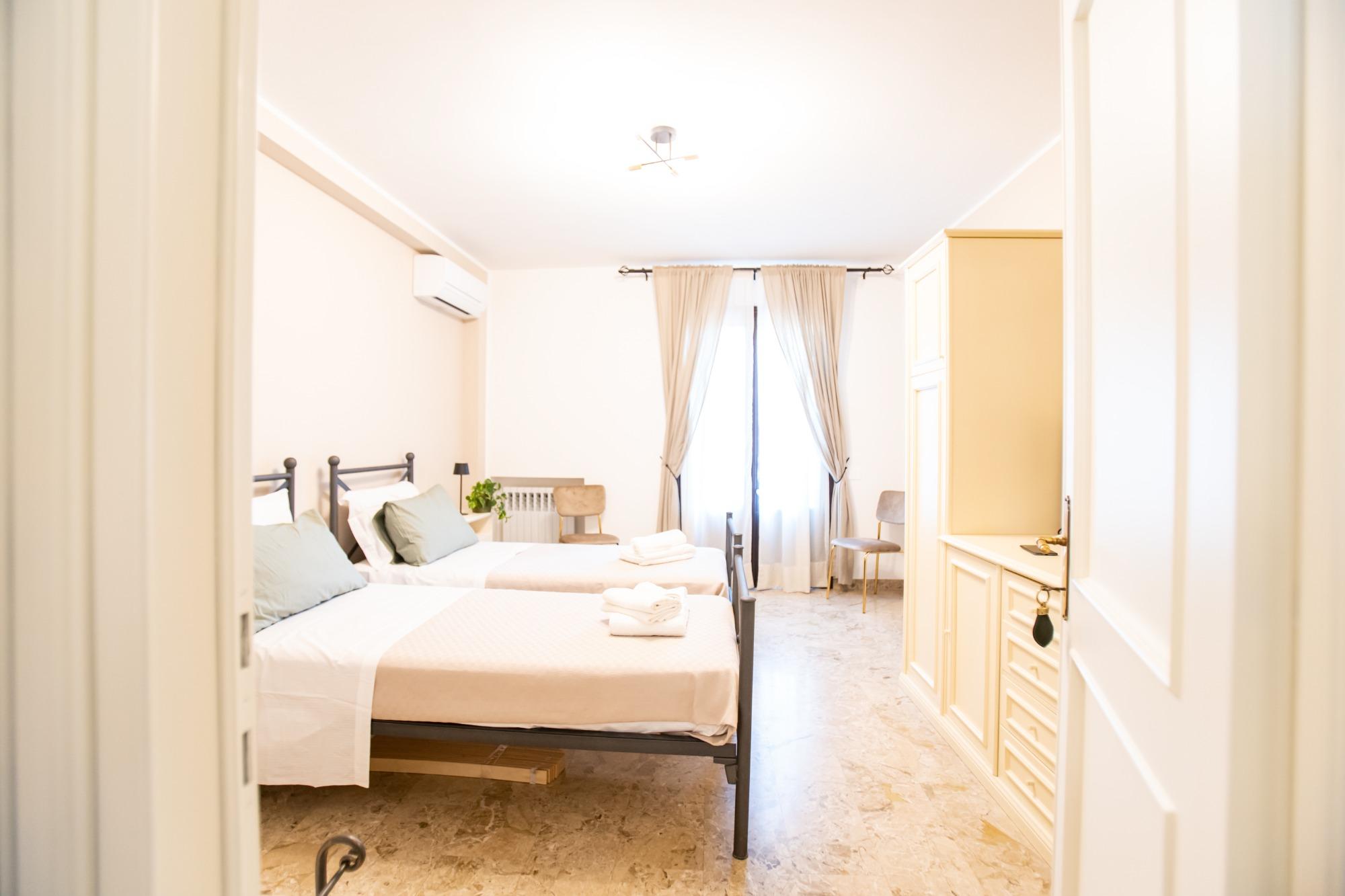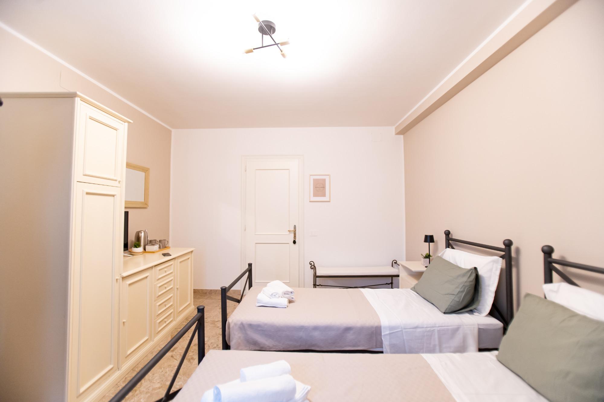 Accogliente e luminosa, questa camera doppia è ideale per coppie, amici o colleghi in viaggio. Arredata con gusto e attenzione ai dettagli, offre due letti singoli (o un letto matrimoniale su richiesta), armadio spazioso, comodini con lampade da lettura, scrivania e TV a schermo piatto. Il bagno privato in camera è moderno e completo di doccia, lavabo, WC, asciugacapelli e set di cortesia. La biancheria da letto e da bagno è inclusa. Disponibile connessione Wi-Fi gratuita, aria condizionata e riscaldamento. Dotata inoltre di comoda terrazza, è perfetta per soggiorni brevi o lunghi ed unisce comfort, privacy e funzionalità.