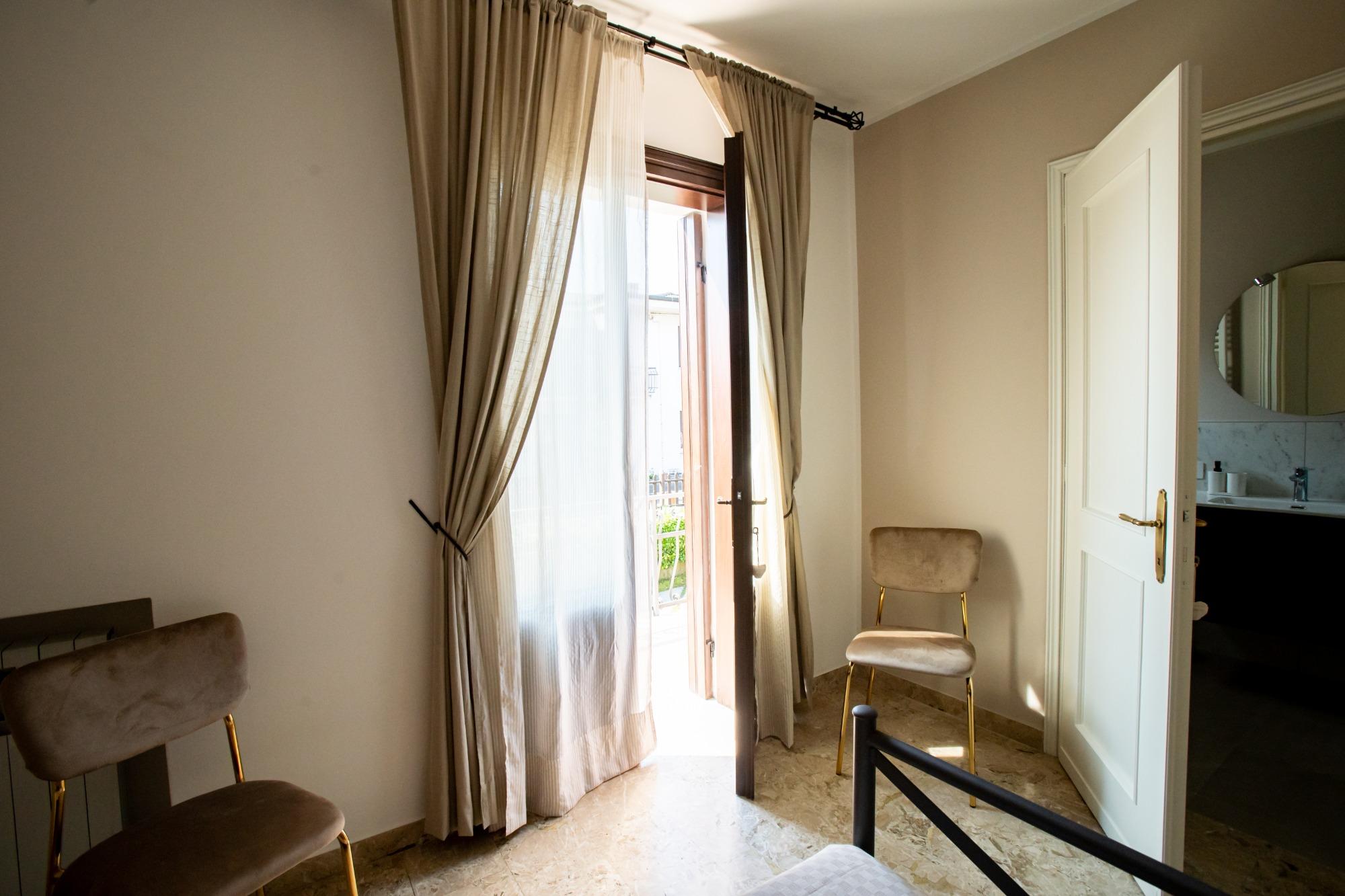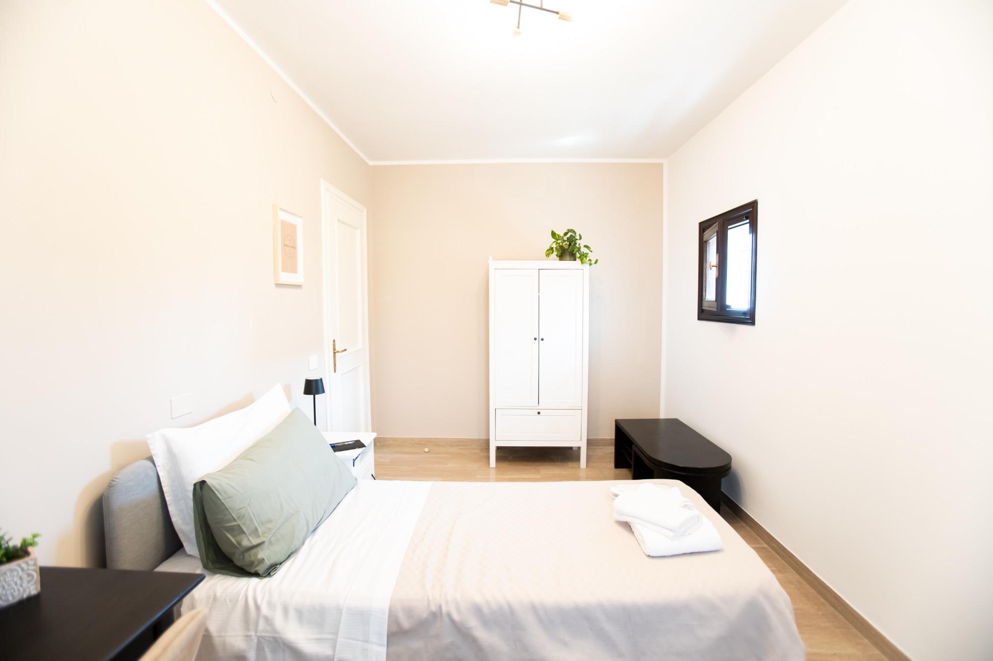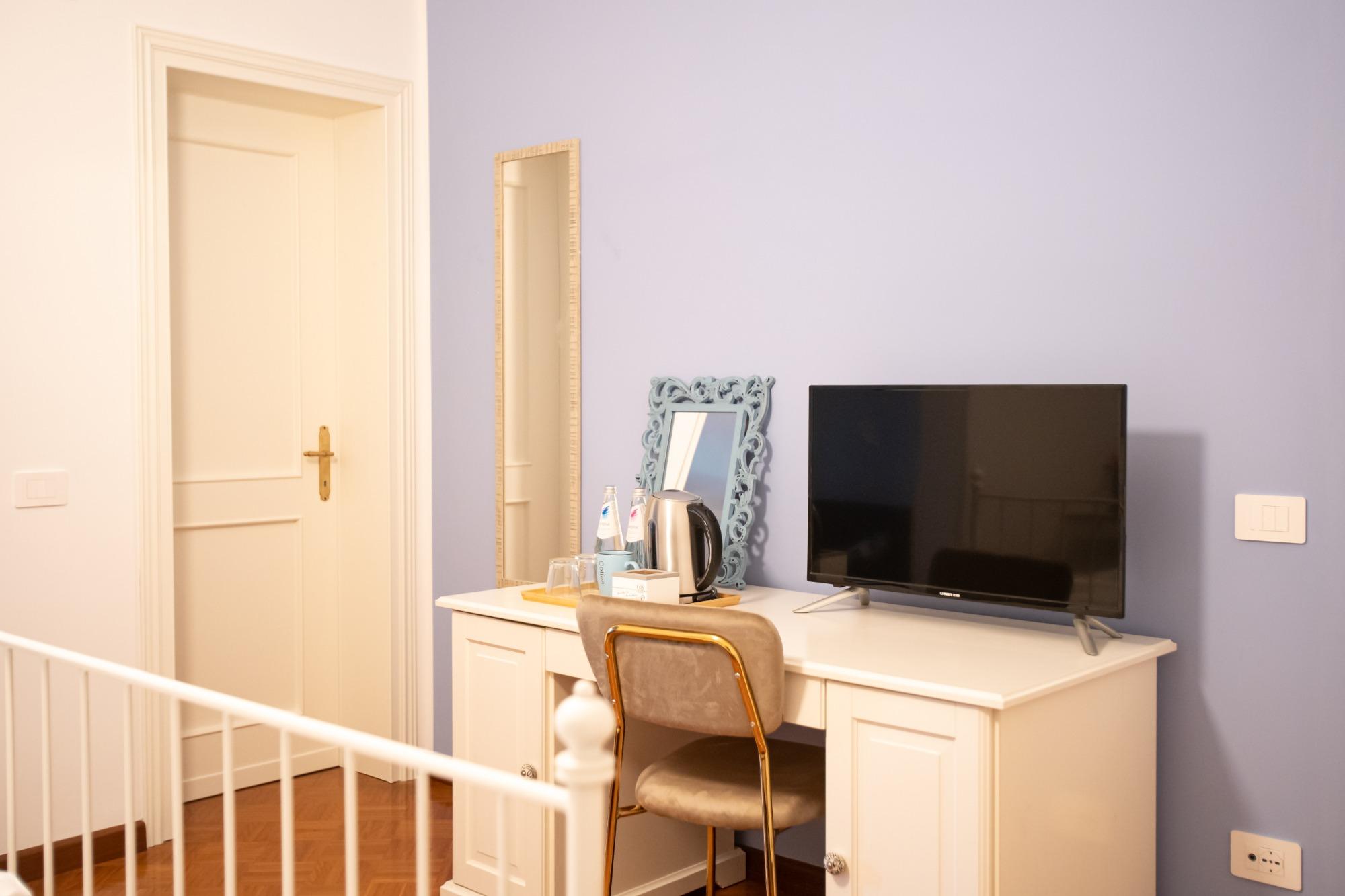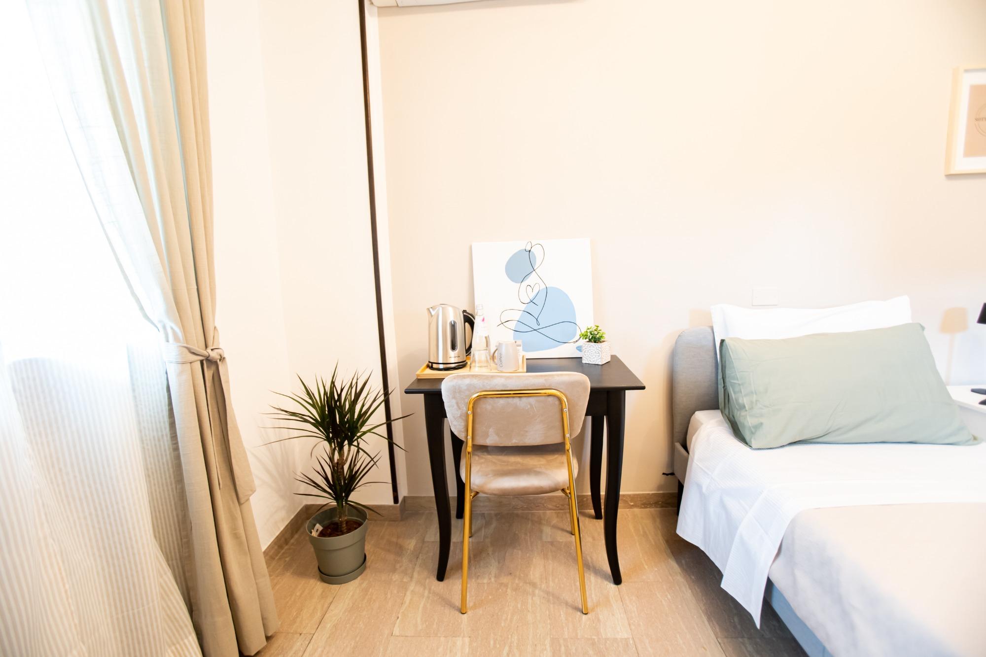 Accogliente e luminosa, questa camera doppia è ideale per coppie, amici o colleghi in viaggio. Arredata con gusto e attenzione ai dettagli, offre due letti singoli (o un letto matrimoniale su richiesta), armadio spazioso, comodini con lampade da lettura, scrivania e TV a schermo piatto. Il bagno privato in camera è moderno e completo di doccia, lavabo, WC, asciugacapelli e set di cortesia. La biancheria da letto e da bagno è inclusa. Disponibile connessione Wi-Fi gratuita, aria condizionata e riscaldamento. Dotata inoltre di comoda terrazza, è perfetta per soggiorni brevi o lunghi ed unisce comfort, privacy e funzionalità.
