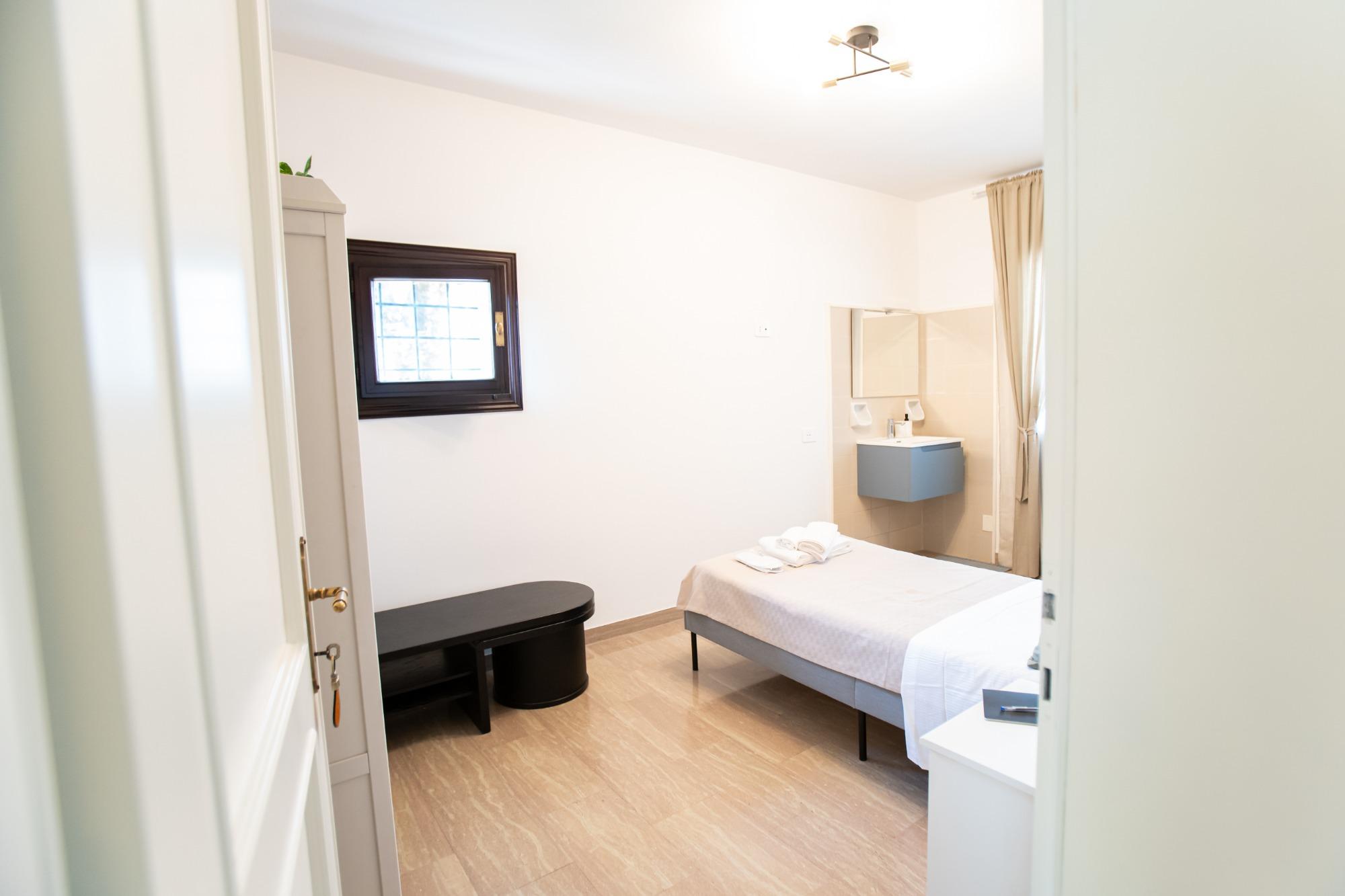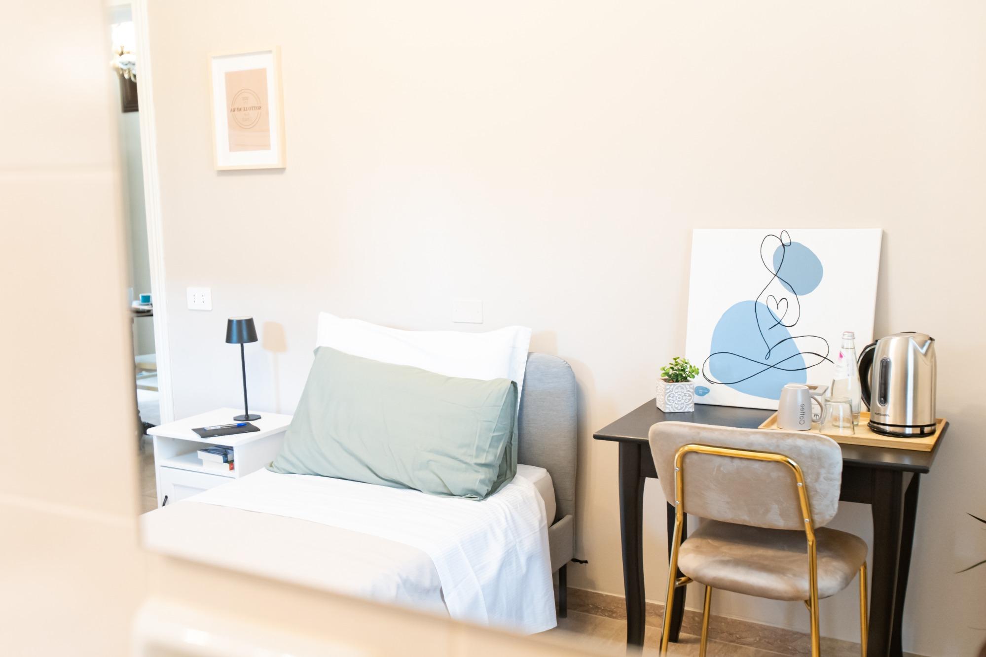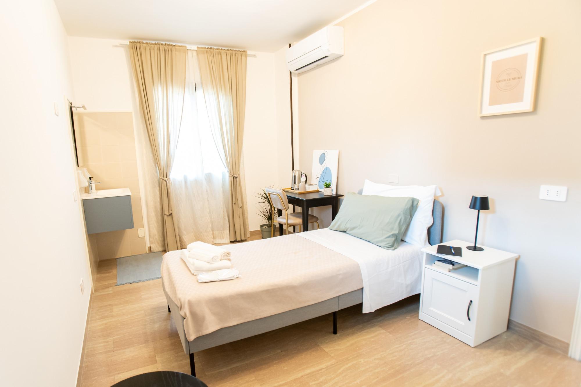 La camera "Porta Treviso" é un'accogliente camera singola, perfetta per viaggiatori singoli o soggiorni di lavoro. La stanza è arredata con gusto e dotata di tutti i comfort essenziali, tra cui un comodo letto singolo, armadio, scrivania e connessione Wi-Fi gratuita. Il bagno, ad uso esclusivo dell’ospite, si trova appena fuori dalla stanza (non condiviso con altri) ed è fornito di doccia, lavabo, WC, asciugacapelli e set di cortesia. La soluzione ideale per chi cerca privacy e funzionalità in un ambiente tranquillo e curato.